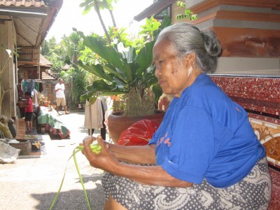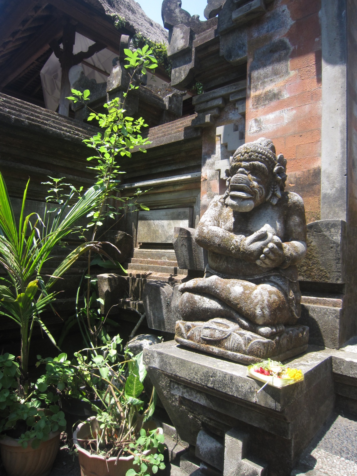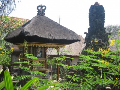 El taxista ens ha expicat que cada casa es construeix el seu propi temple, i el poder adquisitiu de les famílies ve representat per la majestuositat del seu temple. Arribats al poble, el soroll és continu (sobretot pel trànsit) enmig de múltiples perfums d’encens sobresortint dels decorats pòrtics i d’una col·lecció d’ofrenes als peus de les entrades dels comerços. Estàtues decoratives per tot arreu, sobretot indús (religió majoritària de Bali) i algunes de budistes (creença també present a l’illa després de molts anys de convivència durant el primer mil·leni D.C.). Després d’escollir ràpidament un hotel econòmic però amb piscineta, hem donat una primera volta pel poble per tal de començar a descobrir una mica més sobre aquesta cultura tan diferent.