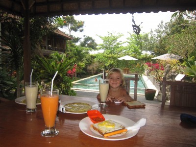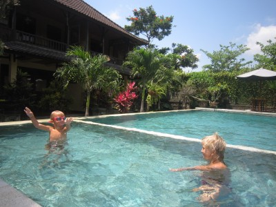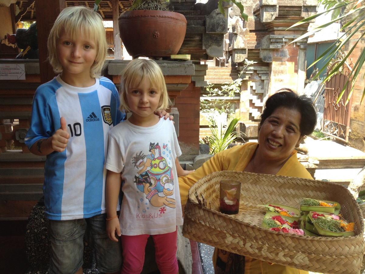 En una altre, just al centre del temple, envoltat també d’habitacions, hem fet una sessió de “Pressing Catch” (lluita lliure) amb el Bernat, on tothom ha pogut comprovar la força desmesurada del petit norueg quan es transforma en superguerrer. Abans de venir a Indonèsia, em pensava que temes tan autòctons i autèntics com les estàtues de pedra, els temples, les ofrenes, els rituals, les persones amb aquestes arrels tan fortes amb la terra i amb les seves tradicions i religió serien només “preparats” pel turista o estarien localitzats en illes molt més llunyanes, i no és així, sinó que ho veus al dia a dia. Veiem que hi ha un culte molt fort a les seves creences, sobretot en la gent més gran. I això és només el principi… Tot just hem començat a olorar l’encens… mentres l’Abril espera al costat de la Karina que li explica els “3 porquets” la meva abraçada just abans de dormir-se…